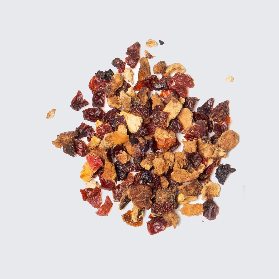 Apple, rose hips, rose bud & petals, strawberries, chaga, lemon peel, orange peel, strawberry lemonade extract, marigold.